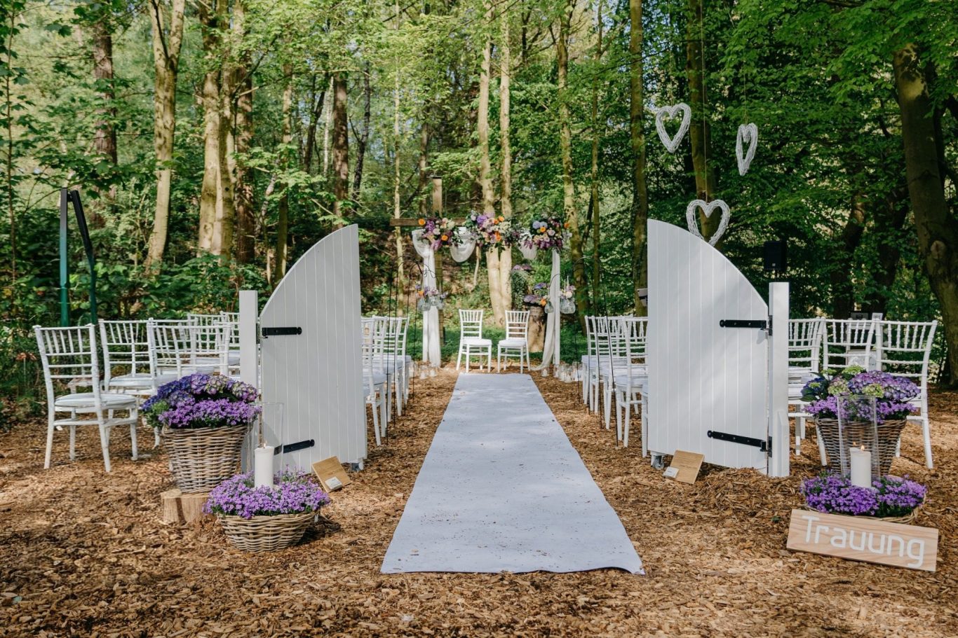 Erleben Sie eine unvergessliche Hochzeit im Wald. In einer romantisch verzauberten Atmosphäre geben Sie sich das Ja-Wort, während die Natur als ehrwürdiger Zeuge dient. Wir übernehmen für Sie die vollständige Organisation und Durchführung, damit Ihr besonderer Tag reibungslos und ganz nach Ihren Vorstellungen verläuft. Von der liebevollen Dekoration bis zur feierlichen Trauung schaffen wir Erinnerungen, die ein Leben lang halten.
